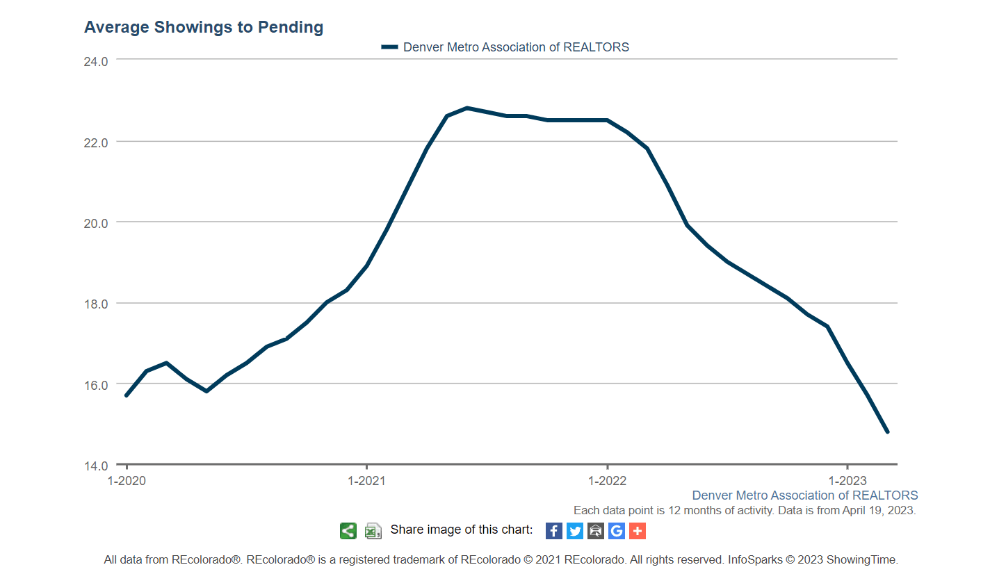 Across the Denver metro area in March 2023, the average showings-to-pending was 14.1. This means